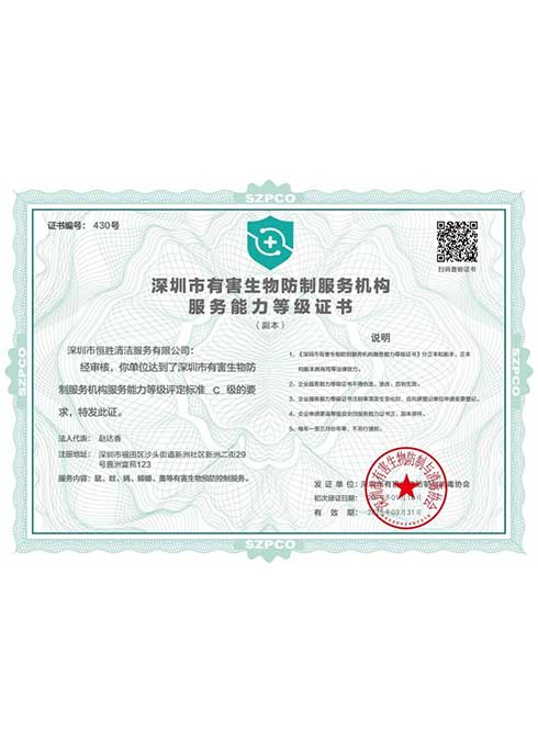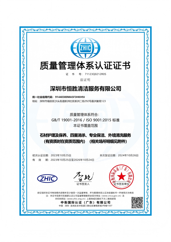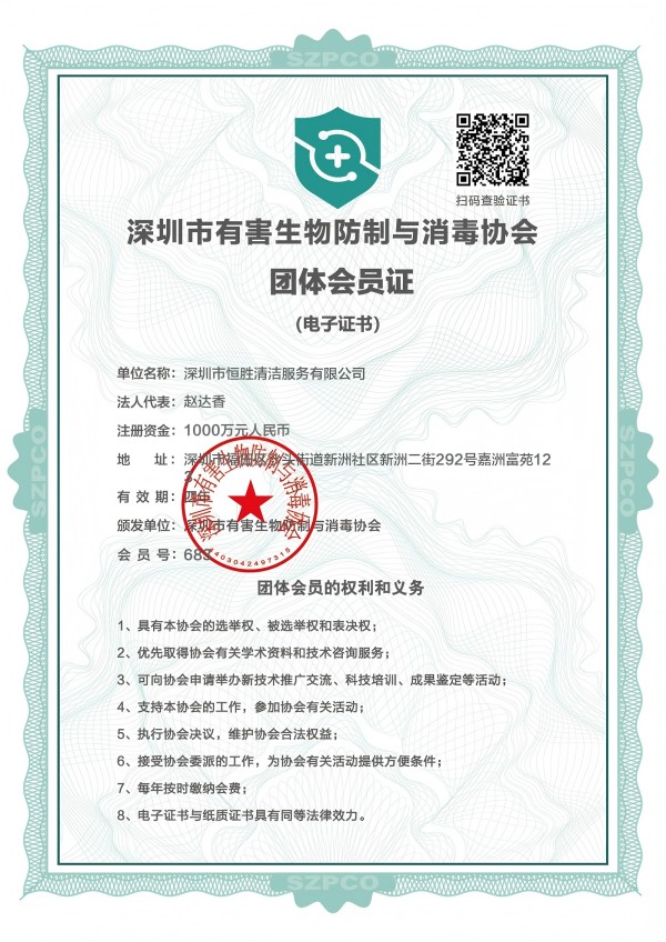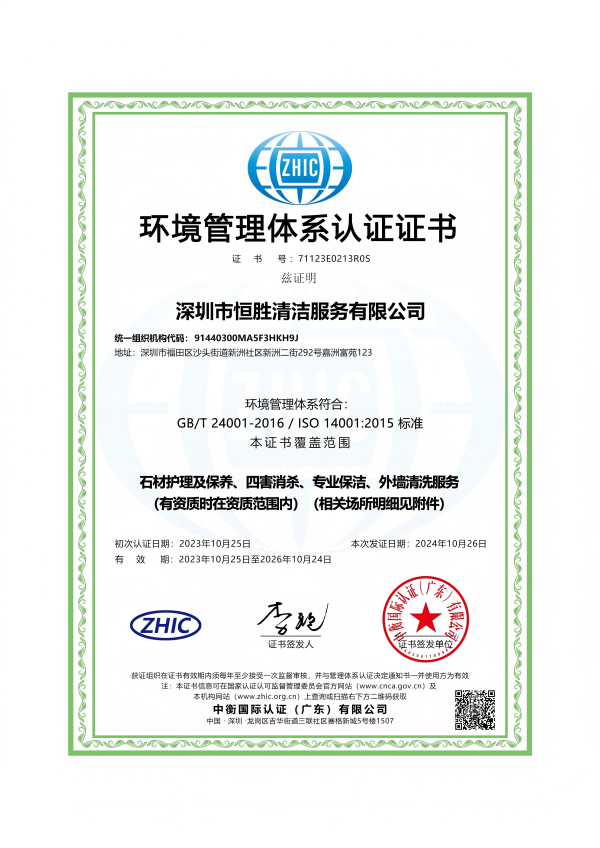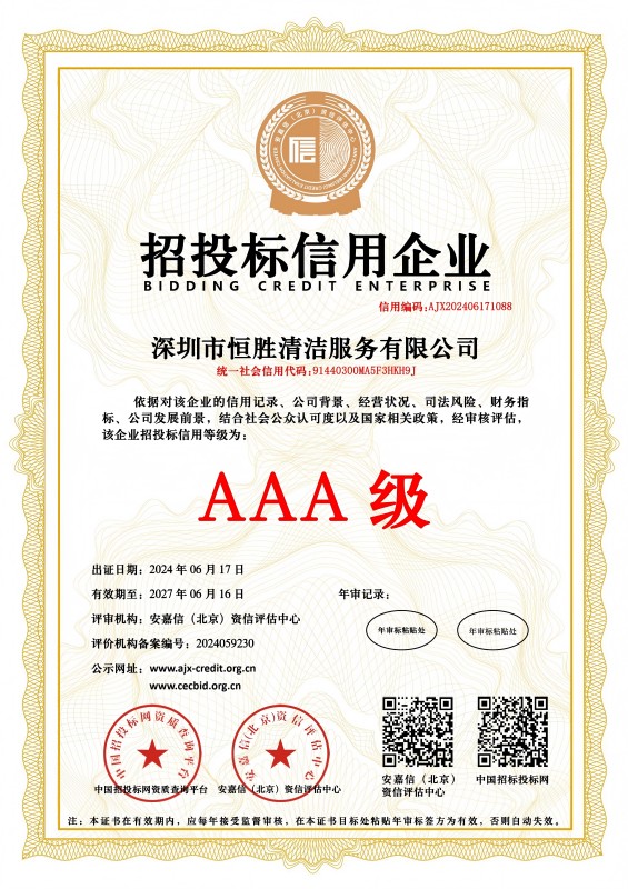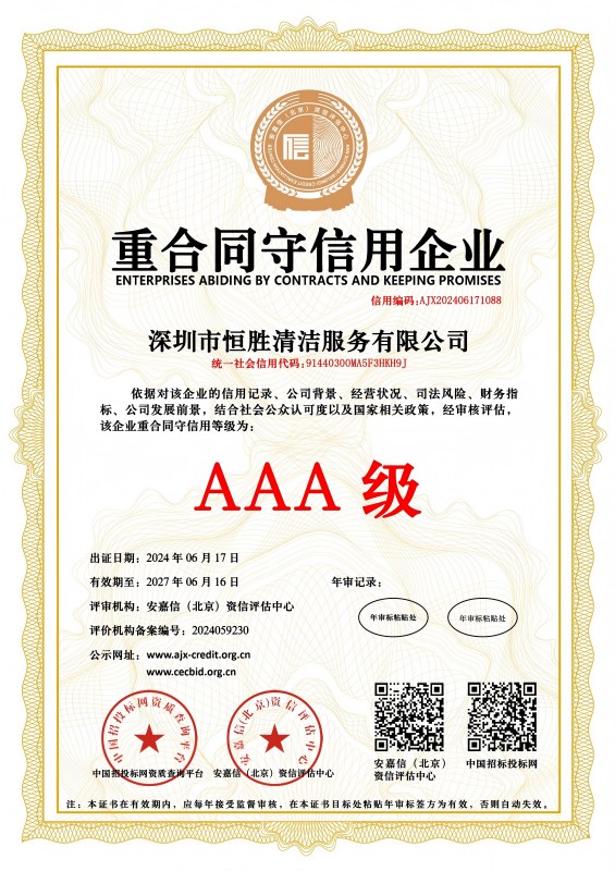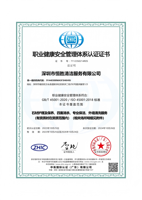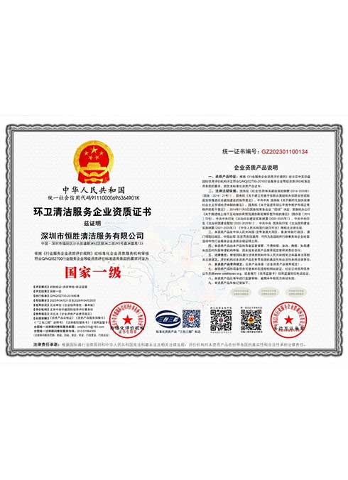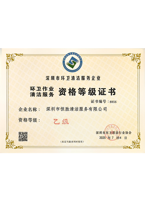 深圳市恒胜清洁服务有限公司成立2018年4月23日。公司注册资金人民币1000万元。是深圳市环卫清洁行业协会会员单位,深圳市清洁服务企业丙级企业,国家一级环卫清洁服务企业。深圳市消杀丙级资质企业。公司始终一贯注重品质控制与管理,通过了ISO9001质量管理体系、ISO14001环境管理体系和GB/T28001职业健康安全管理体系认证。